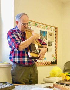 The beautiful manual foot pump organ is one of two organs we use in worship.